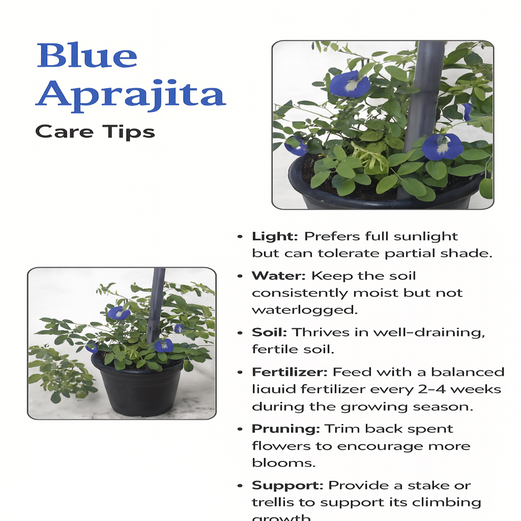 The Blue Aparajita (Clitoria ternatea) is a fast-growing, flowering vine admired for its vibrant, velvety blue flowers with a white center. A sacred and medicinal plant in Ayurveda and Indian tradition, it’s commonly grown for spiritual rituals, health benefits, and natural beauty. This versatile plant is known for enhancing both physical wellness and emotional peace. Blue Aparajita thrives in full sunlight, needs moderate watering, and grows beautifully in pots, gardens, and along fences or trellises. It blooms repeatedly through the warm months and is widely used in making herbal teas, hair oils, dyes, and natural remedies. A symbol of purity, wisdom, and divine femininity, this plant is also linked to Goddess Durga in many cultures. The calming blue flowers are not only a visual treat but also packed with antioxidants and medicinal properties. Whether used as a spiritual plant, herbal remedy, or decorative climber, the Blue Aparajita is a must-have for every garden lover.