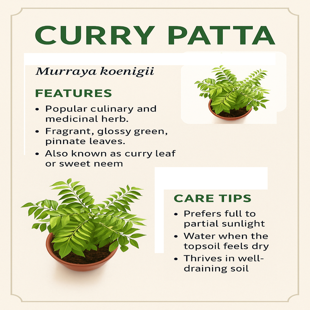 The Curry Patta Plant (Murraya koenigii) is a beloved, fragrant herb found in nearly every Indian household. Its glossy green leaves are prized for their distinct aroma and are a staple in Indian cooking, especially in curries, dals, and tempering. But this plant is not just about flavor—it’s also known for its powerful medicinal properties in Ayurveda. Growing your own Curry Patta at home ensures a fresh, organic supply of leaves throughout the year. This easy-to-grow plant thrives in full sunlight, needs regular watering, and flourishes in pots or open ground. With the right care, it can become a bushy shrub that’s both functional and ornamental. The Curry Patta plant is known to aid in digestion, hair health, diabetes control, and immunity. It’s ideal for home chefs, herbal enthusiasts, or anyone looking to grow their own ingredients in a kitchen garden or balcony. With rich flavor, health benefits, and easy upkeep, it’s a must-have for every Indian home.