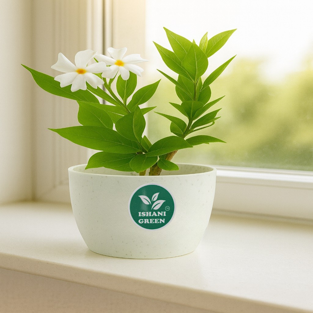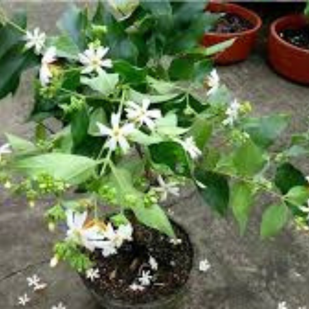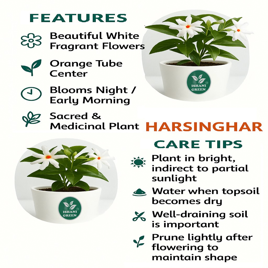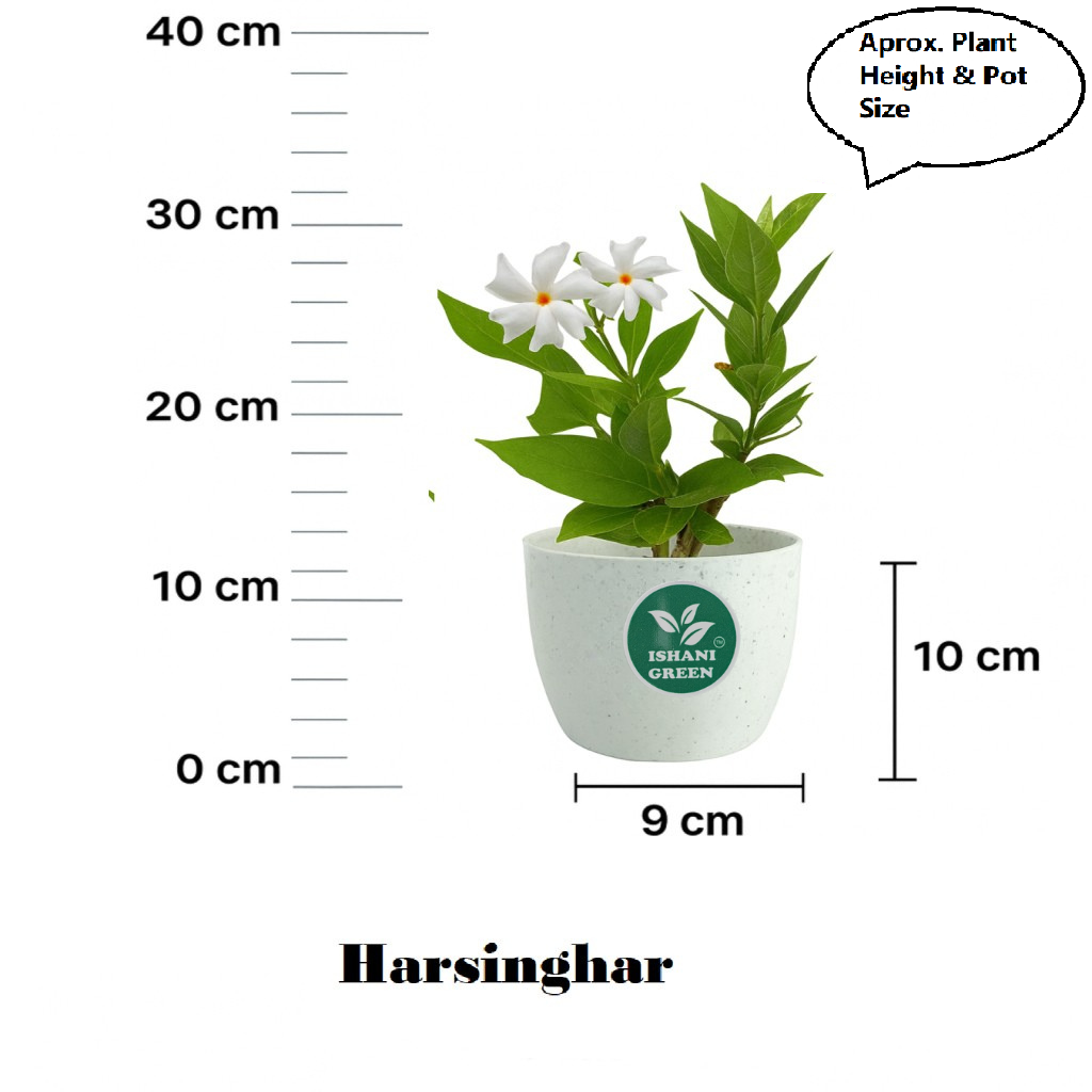 The Harsinghar Plant (Nyctanthes arbor-tristis), also known as Night Jasmine or Parijat, is a beautiful flowering shrub revered in Indian culture for its exquisite fragrance and symbolic significance. Known for its white flowers with orange centers, the Harsinghar blooms at night and releases a sweet, soothing fragrance that fills the air, making it an ideal plant for evening gardens, balconies, and spiritual spaces. This plant is easy to grow and thrives in full sunlight. It requires regular watering, well-drained soil, and benefits from occasional pruning to maintain its shape and encourage healthy flowering. The Harsinghar is often used in religious rituals and festivals, as its flowers are believed to have purifying and spiritual qualities. Besides its aesthetic value, the Harsinghar is also used in traditional herbal medicine for its healing properties related to fever, joint pain, and inflammation. Its unique blooming pattern and rich cultural significance make it an essential plant for any garden enthusiast or spiritual devotee.