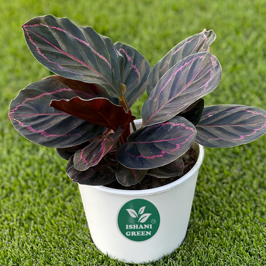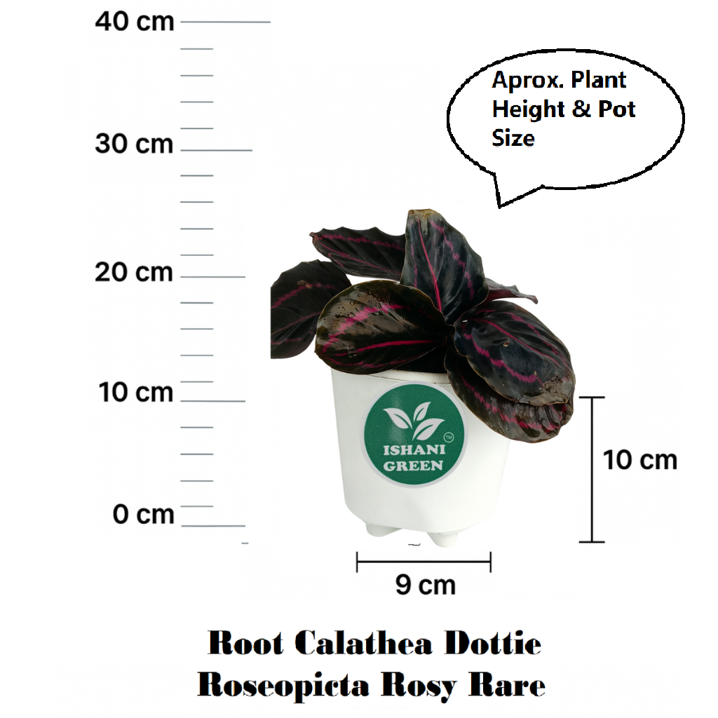 Root Calathea Dottie (Roseopicta Rosy – Rare), botanically known as Calathea roseopicta ‘Dottie’, is a premium and rare indoor foliage plant admired for its dramatic deep purple to almost black leaves highlighted with bright pink outlines. The striking contrast and symmetrical leaf patterns make this Calathea variety a true collector’s plant and a statement piece for modern home and office décor. Calathea Dottie is especially valued for its luxurious appearance and unique color palette. The oval leaves display a rich, velvety texture with neon-pink markings that remain vibrant under proper indoor conditions. Like other Calatheas, this plant is known as a “prayer plant,” as its leaves gently move and fold upward at night, adding a dynamic and lively character to indoor spaces. This rare plant thrives best in bright indirect light, which helps maintain strong leaf color and pattern definition. Direct sunlight should be strictly avoided, as it can fade the foliage and cause leaf burn. Calathea Dottie prefers well-draining, airy soil that retains slight moisture without becoming waterlogged. Water when the top layer of soil feels slightly dry, using clean or filtered water whenever possible, as Calatheas are sensitive to salts and chemicals. High humidity levels are essential for healthy growth. Regular misting, use of a humidifier, or placement in naturally humid rooms such as living areas or near other plants helps prevent leaf edges from drying. The plant requires minimal pruning, limited to removing damaged or old leaves to maintain a neat appearance. Beyond its visual appeal, Calathea Dottie is considered pet-friendly and contributes to a calm, soothing indoor environment. Its bold foliage enhances bedrooms, living rooms, offices, and premium interior setups. Due to its rarity and ornamental value, it also makes an excellent gift for plant collectors and décor enthusiasts. Each plant is nursery-grown with strong roots and carefully packed to ensure safe delivery and quick acclimatization. With proper care, the Root Calathea Dottie Roseopicta Rosy remains a long-lasting, elegant addition that elevates any indoor plant collection with color, movement, and refined beauty.