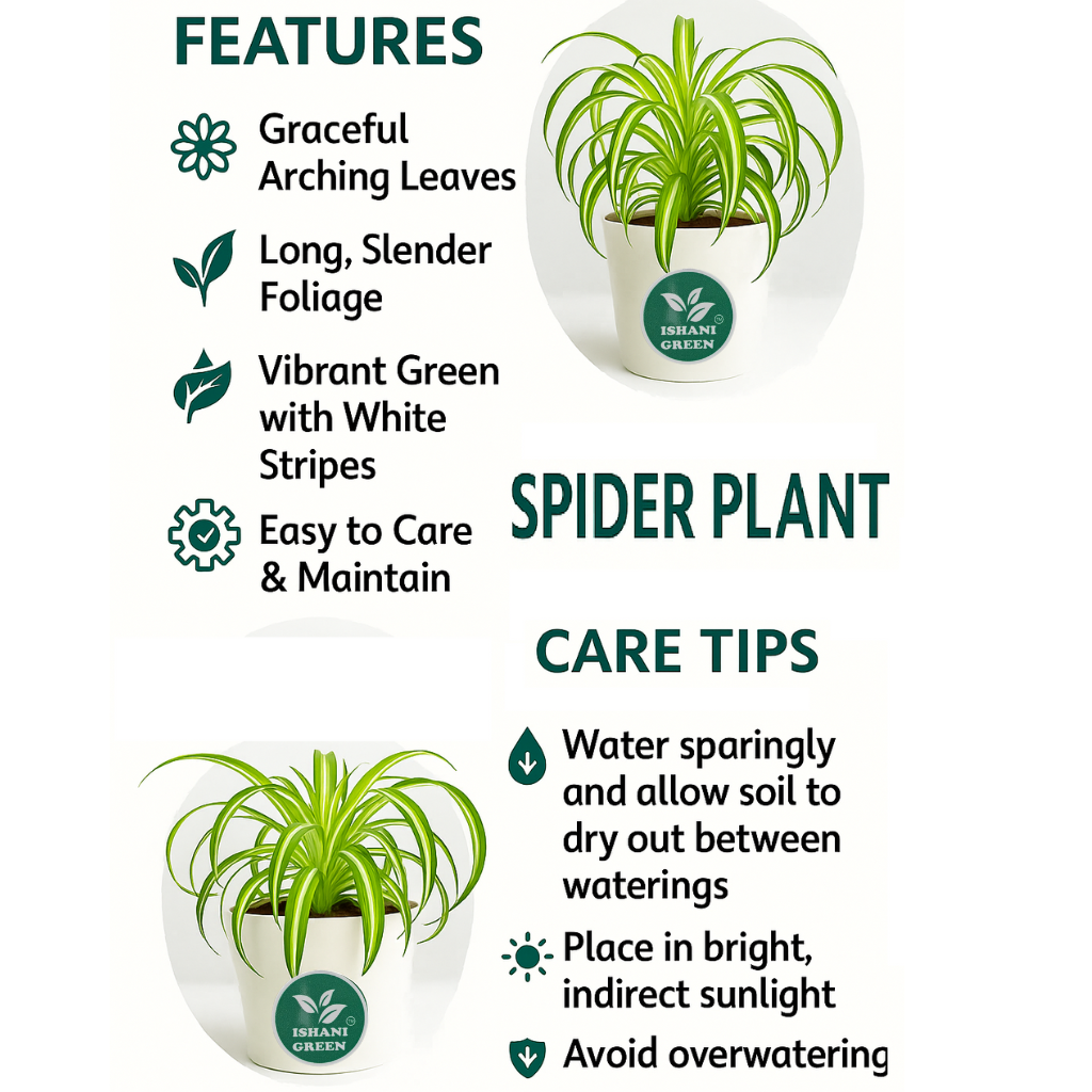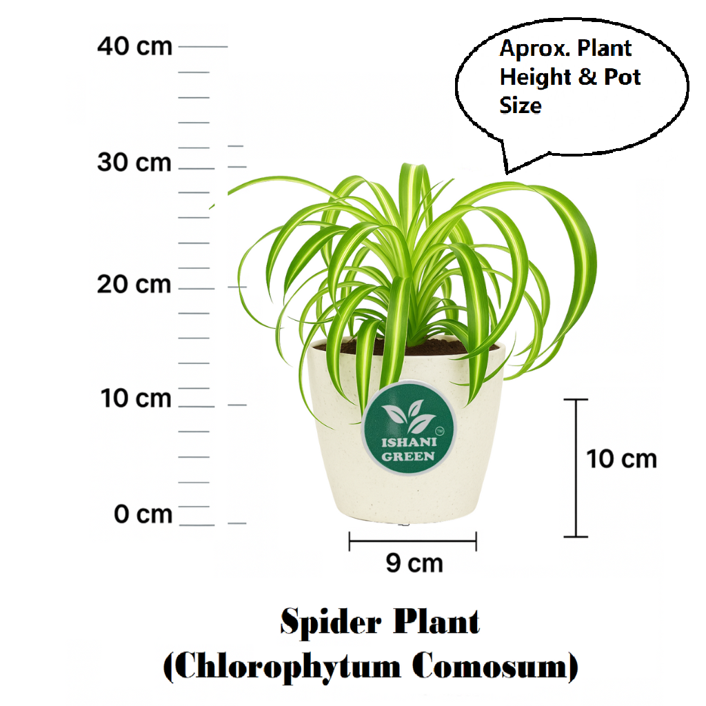 Spider Plant Clorophytum COMOSUM is one of the most popular and easy -to -grow indoor plants and is famous for its elegant and bent green leaves with white stripes, which is a great air factory that removes toxins such as benzene from carbon monoxide, formaldehyde and internal air. The exterior and growth of the spider is the white stripes that grow in the socket, and the plants can be easily produced by producing long stems. In general, he is ideal for a basket, a countertop or solidarity hanging from 12-24 inches of height and width. Management and Service-Lighting: Light and indirect sunlight, but can withstand low lighting conditions. Join: Water, soil is wet once a week, but not vivid. Vegetation period. It is an approved NASA duct that performs air and environmental advantages, as you know, removes harmful toxins such as formaldehyde, xyl roll and carbon monoxide from air. It also increases the level of oxygen and humidity to improve the overall quality of the air. Use symbolism and spiders to symbolize health, protection and luck, giving great gifts for home, office and new businesses. In general, it is placed in the living room, office, bathroom and kitchen, adding green and improving air quality. is ideal for internal and external spaces -Spider thrives in rooms such as home, office and balcony. They are also suitable for pets, so they are safe options for families with animals. Distribution and Growth -Ryu can spread, block the spider (children’s plants) and put it in the soil or water until the roots develop.