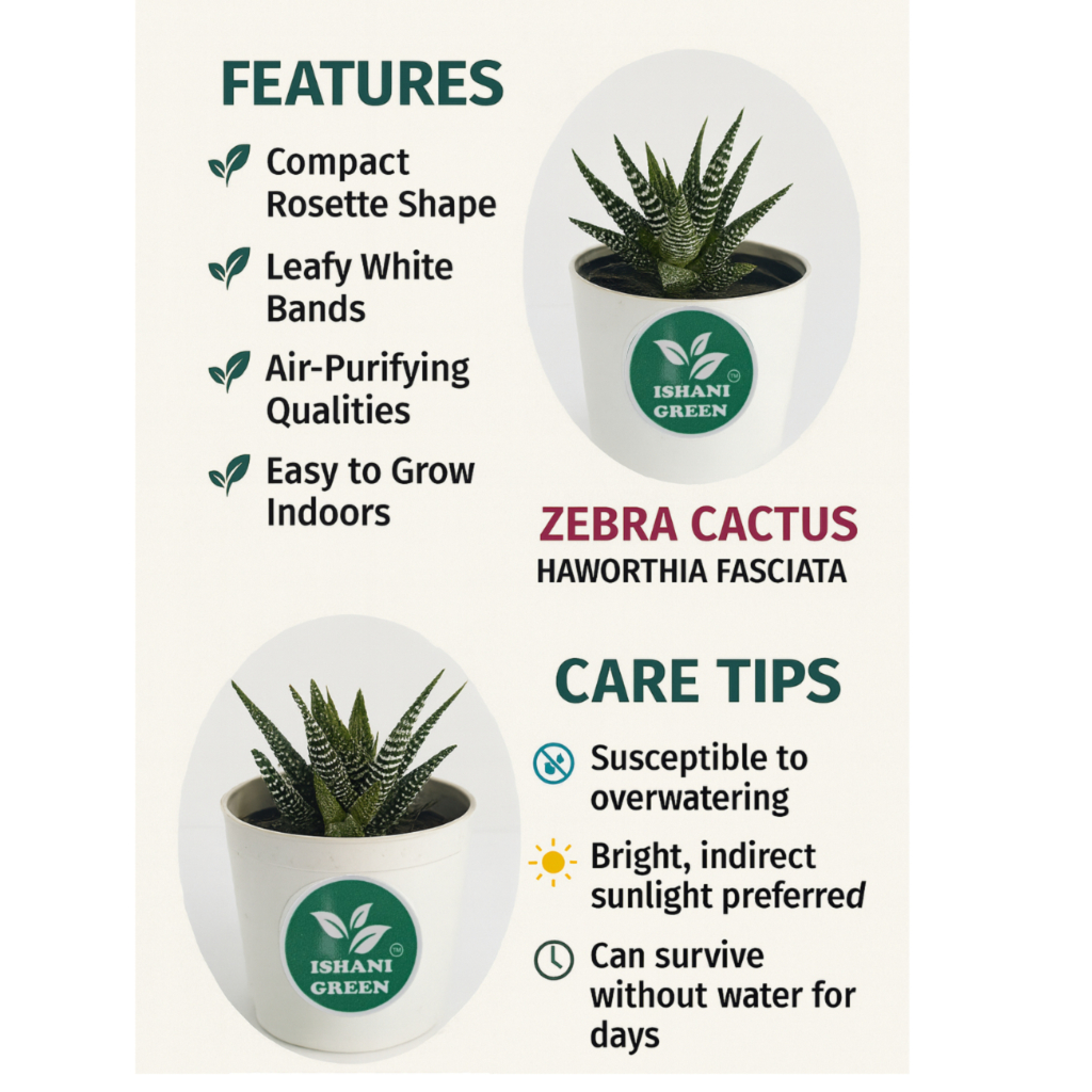 The Zebra Cactus (Hawsethiopsis Fasciata) is famous for its amazing and small and white leaves and is famous for a strap pattern similar to white, Zebra label. The plant, harvested in South Africa, is an excellent choice for both internal and horticulture outdoors due to hard and juicy droughts. The compact size and the necessary nature are popular indoor factories on tables, windows and office premises. The exterior and height zebra zotus has a thick, pointed dark green leaf with a unique white horizontal ruin on the outer surface. In the socket, the height and width reaches about 4-6 inches. Unlike true cactus, there is no spike in the zebra cactus, so it is a safe and friendly option for horticulture in the room. Management and Maintenance -Light: Bright and indirect light thrives but can withstand direct sunlight. Use water once every 2-3 weeks to dry the soil completely between irrigation. Avoid cold drafts.-Equipment: Diluted food every two months during growth, proposal and environmental advantages. It also increases the level of humidity to reduce the dryness of the air. It is a great plant for those who want a beginner or a calm plant, symbolizing power, endurance and stability using symbolism and cactus zebra. Ideal for home, office premises, countertops and terrariums. is ideal for interior and external rooms, which can be grown outdoors in a thrive but warm climatic condition in a room in rooms such as houses and offices. Small size and unique appearance are excellent choices for small spaces and decorative pots. distribution and growth.